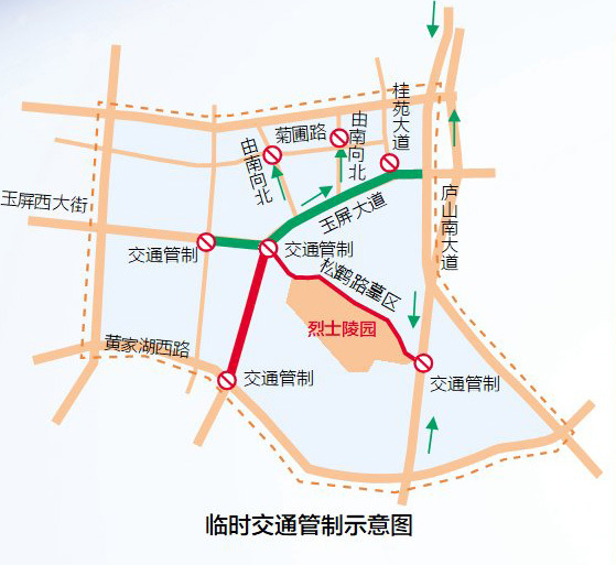 12月20日、23日6时至18时,松鹤路实施交通管制措施,禁止车辆进入墓区;富樱路、广兰大道(黄家湖东路至玉屏东大街段)、玉屏大道(青岚大道至桂苑大道段)视交通流量情况实施相应交通管制措施。