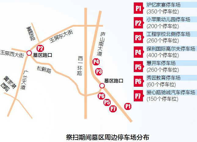 这两天,扫墓的非机动车可以有序停放在墓区周边的庐山南大道、玉屏东大街等两侧人行道上,禁止占用机动车道停放。机动车可在庐山南大道瀛上路口以北两侧非机动车道内、玉屏大道两侧有序单排停放,不得妨碍车辆通行。