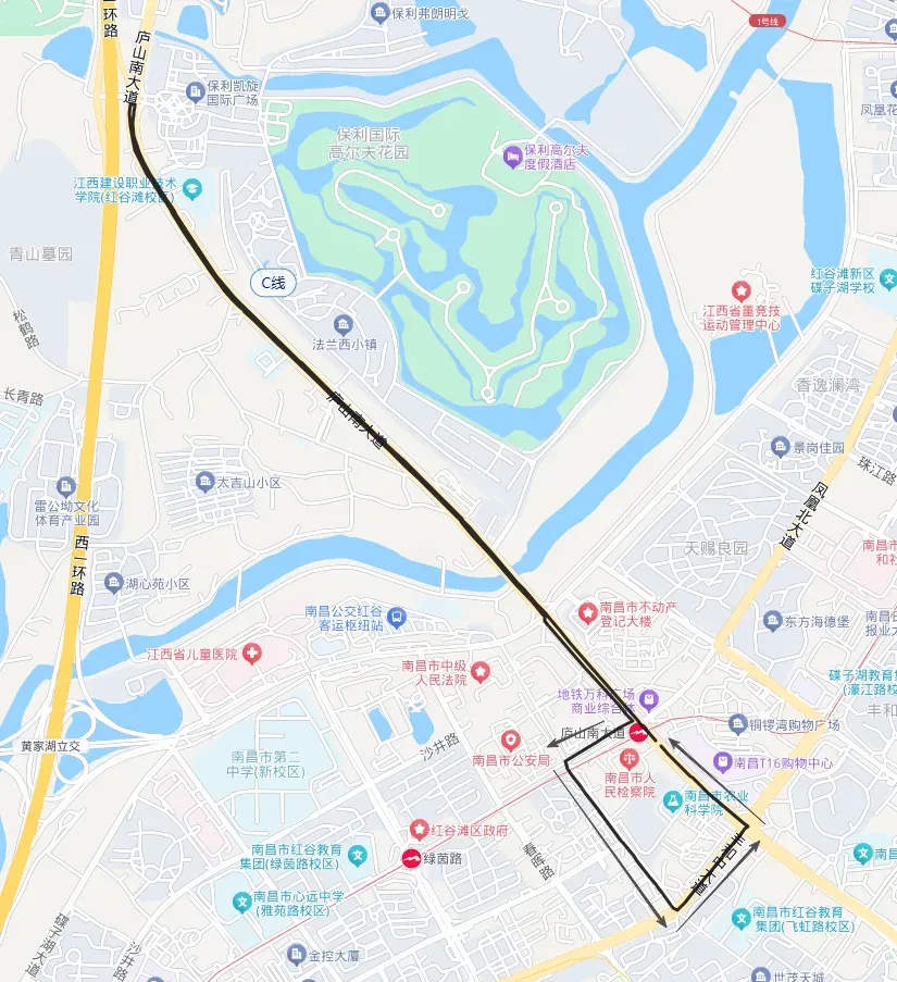 路线为:庐山南大道地铁站1号口—庐山南大道—瀛上老路口(瀛上路口公交站下客)—舍里甲老转盘处调头;返回由庐山南大道—庐山南大道地铁站3号口—凤凰中大道—飞虹路—丰和中大道—庐山南大道—庐山南大道地铁站1号口。