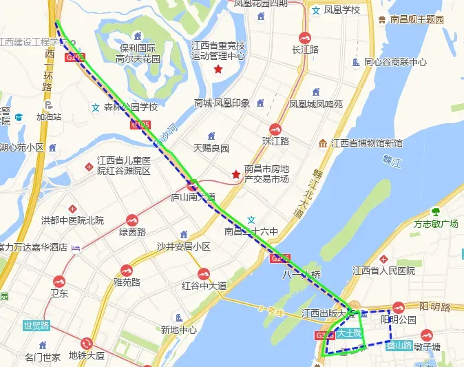 路线为:军转—胜利路—叠山路—八一桥—昌北—庐山南大道—舍里甲老转盘处调头—瀛上老路口;返回由庐山南大道—昌北—八一桥—象山路—叠山路—胜利路—军转。