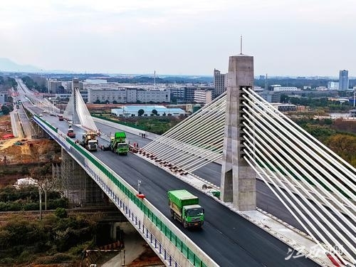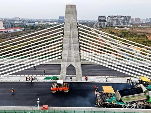 12月22日,赣江新区新祺周片区,在阳光大道跨京九铁路和昌九城际铁路转体斜拉桥项目建设现场,工人们抢抓晴好天气,紧张有序地进行桥面沥青摊铺施工,标志着大桥建设进入通车前的最后冲刺阶段。通讯员 袁骏摄