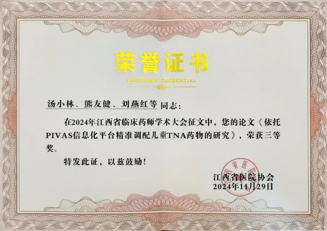 本次会议由江西省研究型医院学会药事管理分会、江西省医院协会药事管理专业委员会主办,经过单位推荐、专家评审、面向社会公示等环节,江西省儿童医院药学部陈昱获评江西第十届“优秀医院药师”,汤小林、熊友健和刘燕红等撰写的论文《依托PIVAS信息化平台精准调配儿童TNA药物的研究》获评“优秀论文三等奖”。