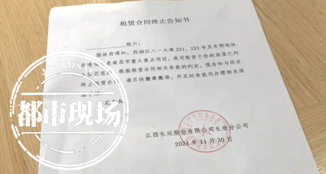 今年11月30日,江西长运股份有限公司长欣分公司发给附近商户们的告知书称:接政府通知,西湖区八一大道221、223号及东侧地块改造项目是南昌市重大重点项目,我司租赁于你的房屋已列入征迁范围,根据租赁合同相关条款的约定,现告知与你并终止租赁合同,请尽快搬离撤场,并及时来我司搬离相关退场手续。