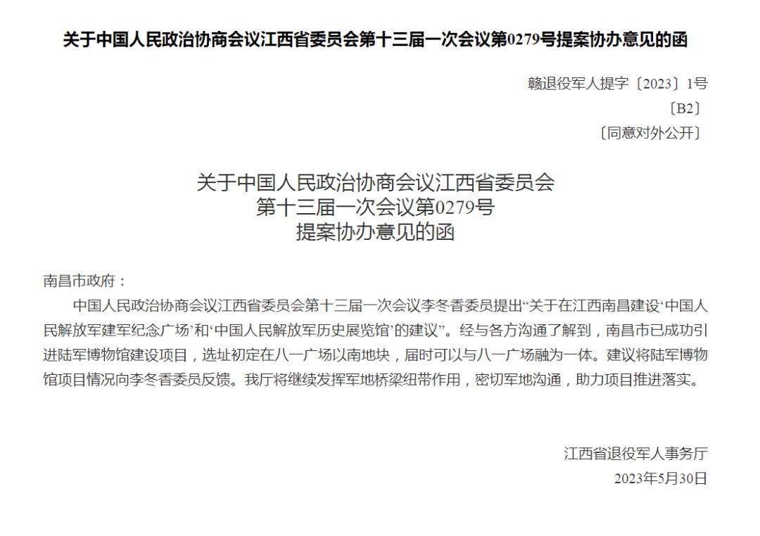 去年5月30号,江西省退役军人事务厅发布的“关于中国人民政治协商会议江西省委员会第十三届一次会议第0279号提案协办意见的函”就提到南昌市已成功引进陆军博物馆建设项目,选址初定在八一广场以南地块。