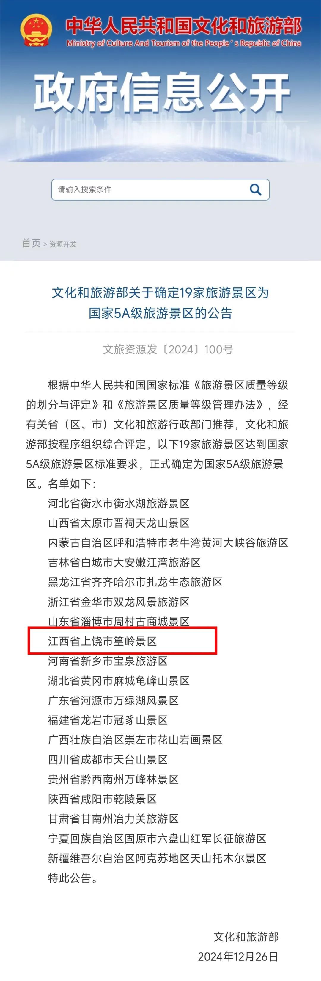 喜讯传来!2024年12月26日,文化和旅游部正式发布公告,上饶婺源篁岭景区正式获评国家5A级旅游景区!至此,上饶市国家5A级旅游景区增至4家(三清山、江湾、龟峰、篁岭),国家5A级旅游景区数量位列全国设区市第三(并列)!
