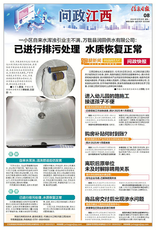 近日,万载县的齐先生(化姓)在大江网《问政江西》发帖反映,其居住的万载县城北佳园自来水浑浊,且在自来水公司清洗管道后,水质依旧呈浅黄色,严重影响居民日常用水。对此,万载县润泉供水有限公司回应,已经对供水主管网进行排污处理,现已恢复正常水质。