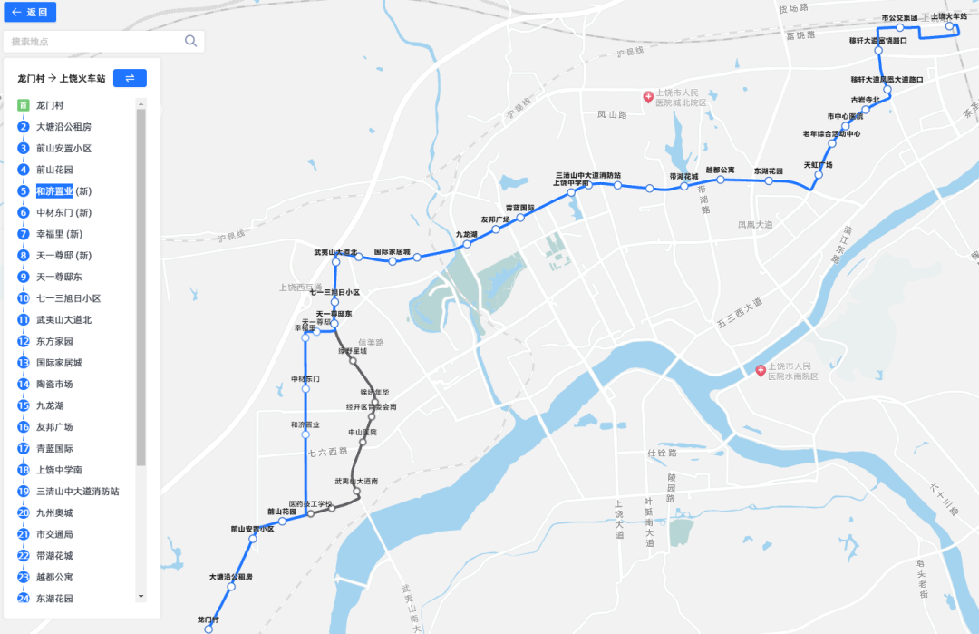 取消部分武夷山大道、惟义路路段线路走向,取消停靠“天一尊邸东、绿野星城、锦绣年华、经开区管委会南、中山医院、武夷山大道南、博能信江印象、医药技工学校”公交站点,绕行吉阳西路、兴园大道路段,临时增加停靠“天一尊邸、幸福里、中材东门、和济置业”公交站点,其中T16路增加停靠“天一尊邸、和济置业”公交站点,参考下图蓝线: