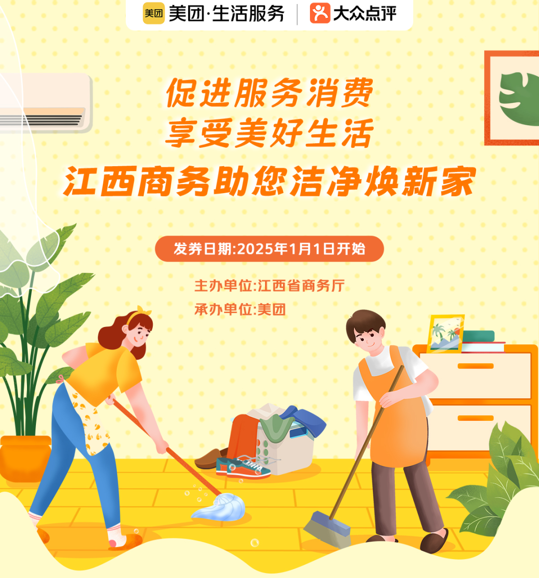 为落实《国务院关于促进服务消费高质量发展的意见》精神,丰富消费场景,优化消费环境,通过发放家政服务消费券,鼓励消费者参与生活服务品类的消费,江西省商务厅联合美团共同举办的“江西商务助您洁净焕新家”消费促进活动将于1月1日正式启动,通过美团、大众点评发放330万元家政消费券。