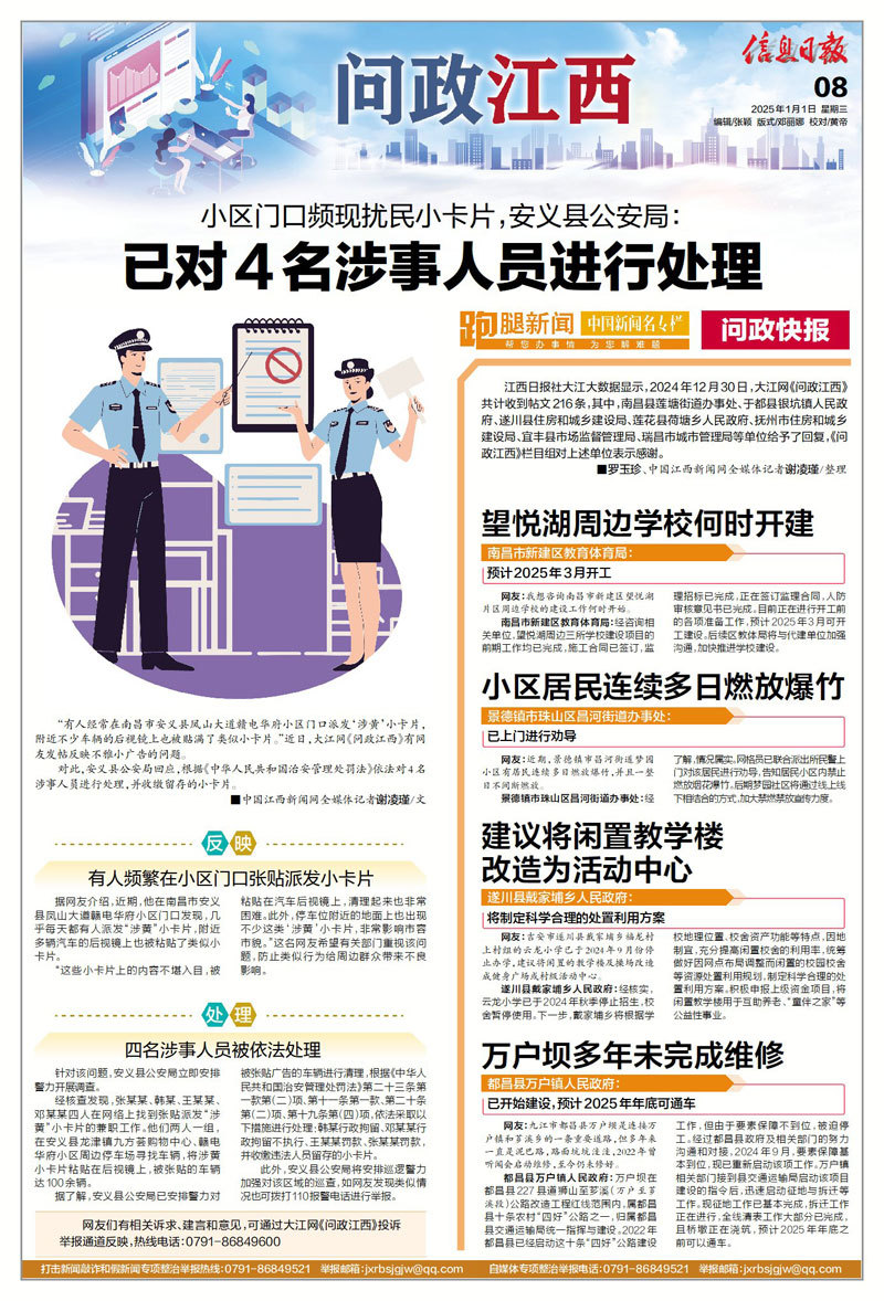 江西日报社大江大数据显示,2024年12月30日,大江网《问政江西》共计收到帖文216条,其中,南昌县莲塘街道办事处、于都县银坑镇人民政府、遂川县住房和城乡建设局、莲花县荷塘乡人民政府、抚州市住房和城乡建设局、宜丰县市场监督管理局、瑞昌市城市管理局等单位给予了回复,《问政江西》栏目组对上述单位表示感谢。