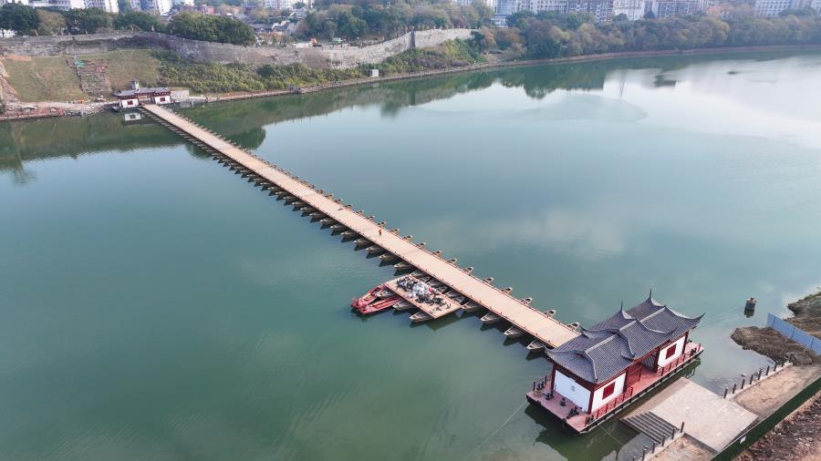 12月31日,赣州西河浮桥横卧在章江之上。西河浮桥项目已于12月29日完成全部浮船桥体拼装,实现桥面全线拉通,目前正在进行两岸码头、游步道等附属设施建设工作,预计春节前建成对外开放。西河浮桥项目位于三江口片区章江段,连接河套老城区与水西片区,桥长约225米、桥面宽5米。项目建成后不但可以连接章江两岸的郁孤台历史文化街区和水西老街特色商业区,为赣州的旅游业增添一张新的名片,而且可以提升两岸市民出行便捷度,增强群众幸福感。(记者欧艳芬 通讯员谢飞)