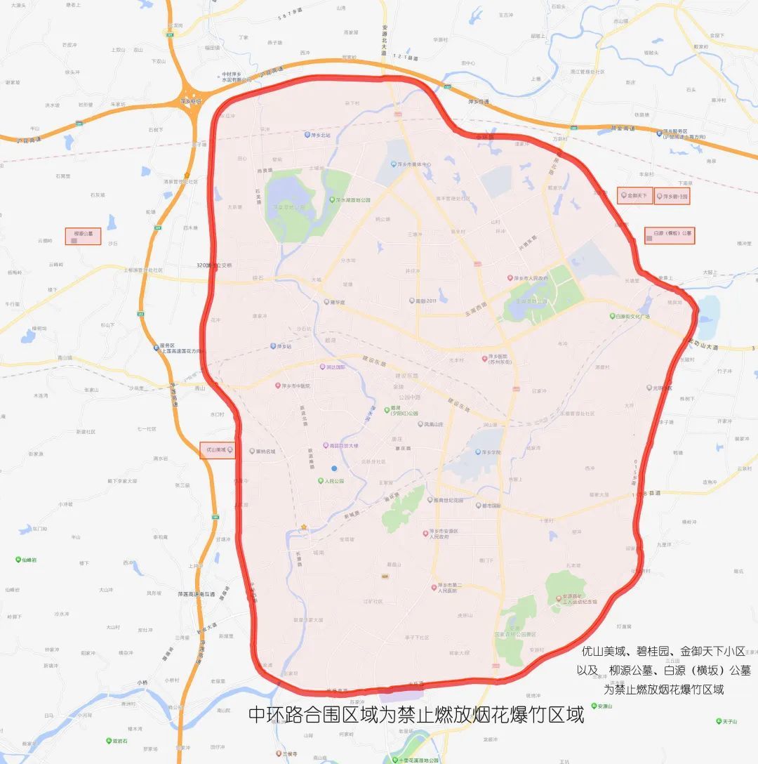 除中环路合围区域外,安源区安源镇、五陂镇、横龙街、白源街全域和青山镇青山村,高坑镇茶亭村、云泉村;经开区境内上莲高速、沪昆高速合围区域为倡导禁止燃放区域。