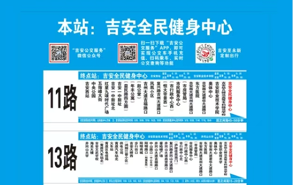 11路公交:吉安西站—中央公园—五指峰大街—红星九颂时代广场—吉安一中新址北—吉安一中新址—益民路四方圆—年丰公寓—赵公堂—吉州大道吉福路口—凤凰小区—复兴路吉州大道路口—恒大帝景西—市行政中心西—市民服务中心—市房管局—吉安南大道吉州大道路口—东方医院—吉安南大道君华大道路口—奥体中心—吉安职业技术学院—吉安幼儿师范高等专科师范学校—吉安全民健身中心。