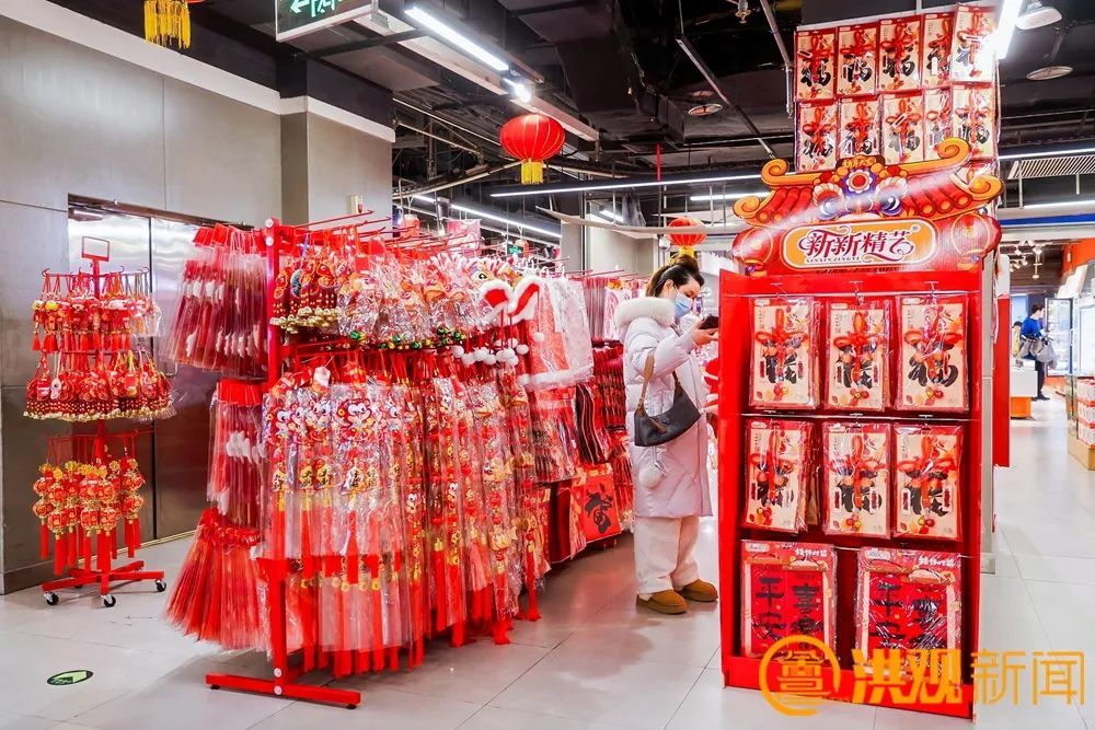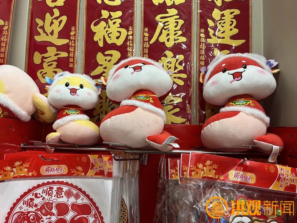 “店里含蛇元素的灯笼、红包、对联、窗花、摆件等小商品有很多。元旦期间,超市有打折促销活动,很多市民趁着打折来采购年货商品。蛇形毛绒玩具特别受中小学生喜欢,销售很火爆。”南昌县四喜悦购生活超市工作人员陶水妹说道。