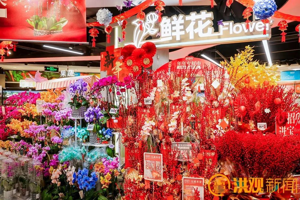 走进盒马鲜生(地铁万科店),迎面而来的便是浓浓的中国风,银柳、水仙、大花蕙兰、朱顶红、蝴蝶兰等年宵花争奇斗艳,年节喜庆氛围拉满。货架上,各类新鲜的蔬菜、水果琳琅满目,肉类、水产等农副产品货多量足,工作人员正拉着载满货品的推车穿梭于货架之间。