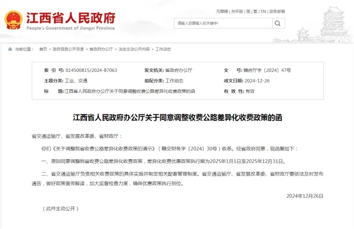 近日,省政府办公厅印发了《关于同意调整收费公路差异化收费政策的函》(赣府厅字〔2024〕47号),批准了我省2025年收费公路差异化收费政策实施方案。其中,包含了我市主动提请实施的福银高速、杭瑞高速部分路段差异化收费政策。