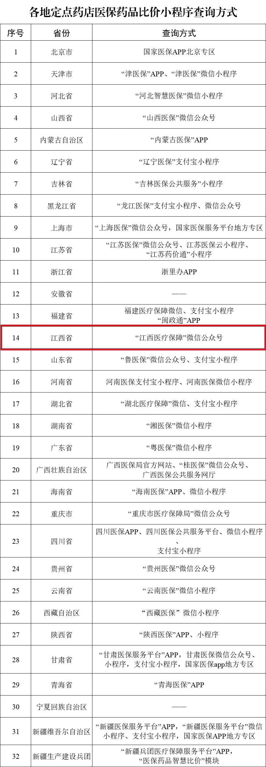 2024年7月份以来,先后有北京、天津、河北、山西、内蒙古、辽宁、吉林、黑龙江、上海、江苏、浙江、福建、江西、山东、河南、湖北、湖南、广东、广西、海南、重庆、四川、贵州、云南、西藏、陕西、甘肃、青海、新疆等29个省(自治区、直辖市)以及新疆生产建设兵团陆续推出覆盖全省的定点药店比价小程序。群众可通过当地医保局APP、微信小程序、微信公众号、支付宝小程序等途径获取药品比价,实现药品价格在手机上一键查询、实时比对和位置导航,同时部分省份定点药店比价程序还提供了库存信息展示、异常价格提醒、价格趋势分析等相关功能。