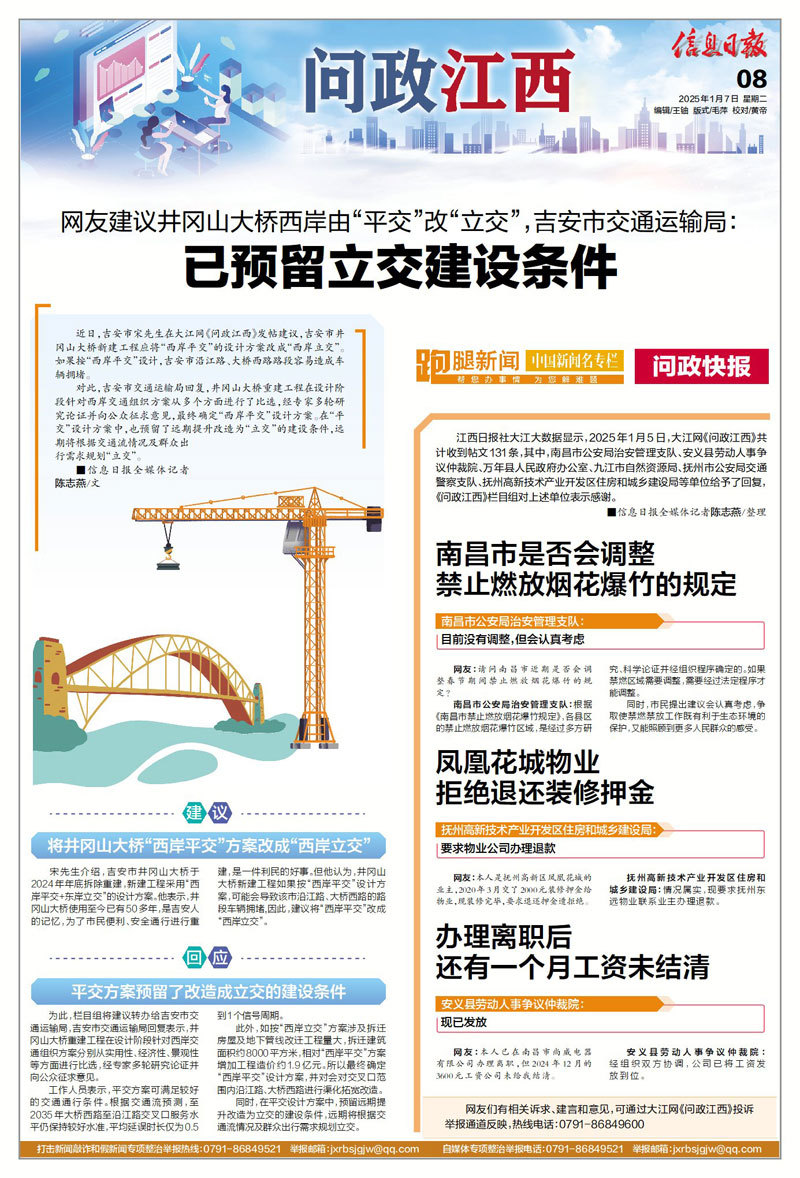 为此,栏目组将建议转办给吉安市交通运输局,吉安市交通运输局回复表示,井冈山大桥重建工程在设计阶段针对西岸交通组织方案分别从实用性、经济性、景观性等方面进行比选,经专家多轮研究论证并向公众征求意见。