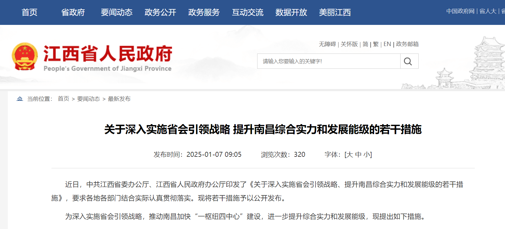 江西新闻客户端讯(全媒体记者朱叶)近日,中共江西省委办公厅、江西省人民政府办公厅印发了《关于深入实施省会引领战略 提升南昌综合实力和发展能级的若干措施》。