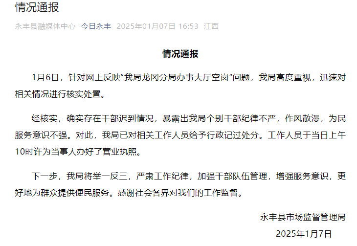 1月7日,永丰县市场监督管理局发布情况通报:1月6日,针对网上反映“我局龙冈分局办事大厅空岗”问题,我局高度重视,迅速对相关情况进行核实处置。