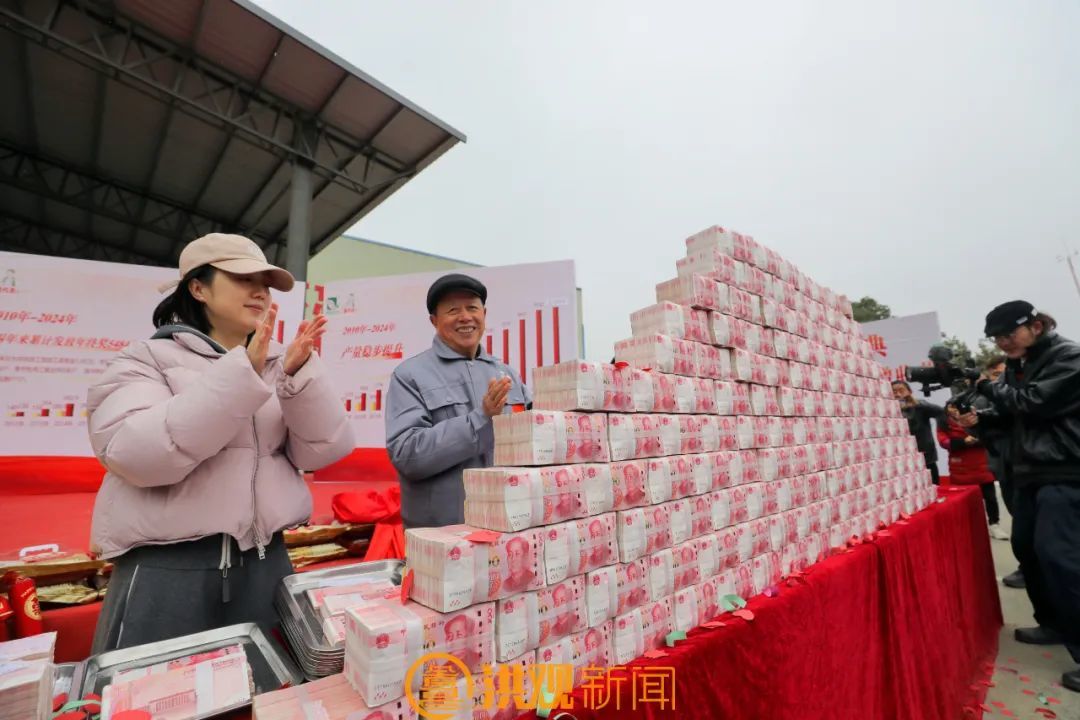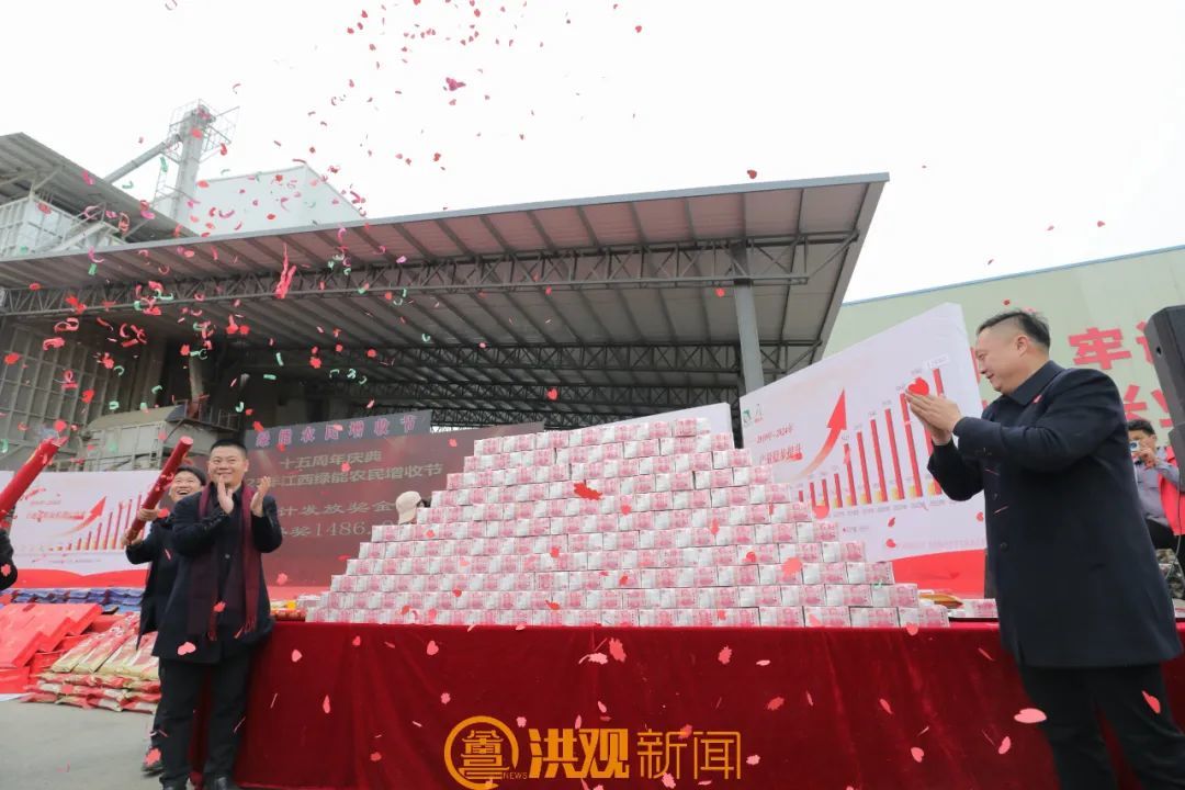 1月8日上午,在南昌市安义县鼎湖镇西路村绿能公司农民增收节现场,种粮大户凌继河又在给农民发年终奖,足足有1486.07万元的现金垒成一座“金字塔”,被点到名的超产奖的农民等人员喜滋滋地上前领奖,现场不少人的脸上洋溢着灿烂的笑容。