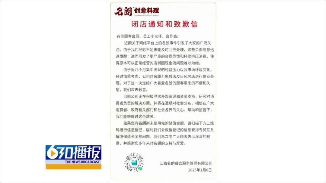 在名朗创意料理的微信公众号上,记者看到1月6日公众号发出一份闭店通知和致歉信,信上表示由于近几个月集中出现经营压力以及市场环境变化,经过慎重考虑,公司对名朗万象店及日风居店进行歇店,并积极寻求资金支持,度过这个难关。随后,记者拨打了名朗公司的加盟热线和微信公众号的客户电话,但不是处于空号状态,就是无人接听。由于无法联系商家,消费者担心充值卡里的钱怕是“打水漂”了。