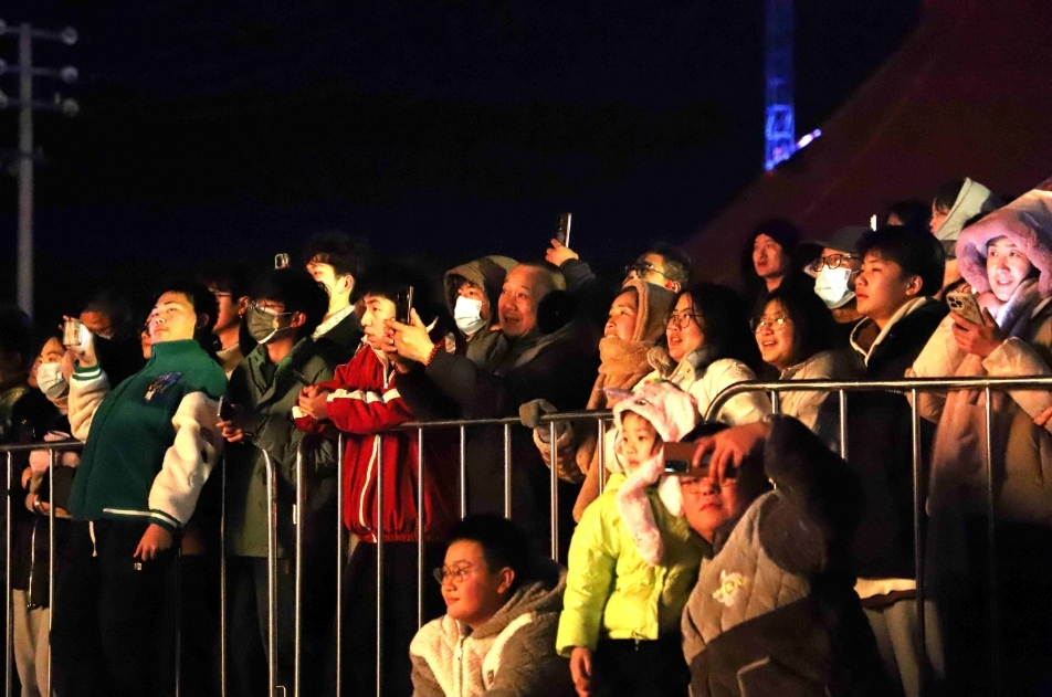 市民在逛市集、买年货、品美食的同时,也是一饱眼福,观看了一场浪漫烟花秀,感受“非遗魅力”。广场中央,炉火正旺,打铁花表演正式拉开序幕。铁花艺人在大圆盘的铁罐中加入铁水,随后迅速转动,铁水在空中划出一道道耀眼的弧线,凝固成璀璨夺目的“风火轮”,如同夜空中最亮的星辰,引得现场观众连连惊叹。铁花艺人又是一勺铁水,奋力一击,千万花火从地面冲向高空,绽放璀璨,不免让人想到“火树银花不夜天”诗句。铁花艺人又表演另一绝技——非遗火壶,快速地转动火壶,只见铁花飞舞,将夜空点亮,震慑了欢呼的人群,场面蔚为壮观。