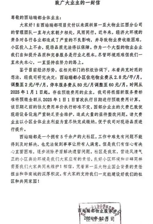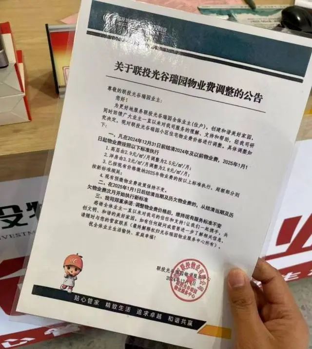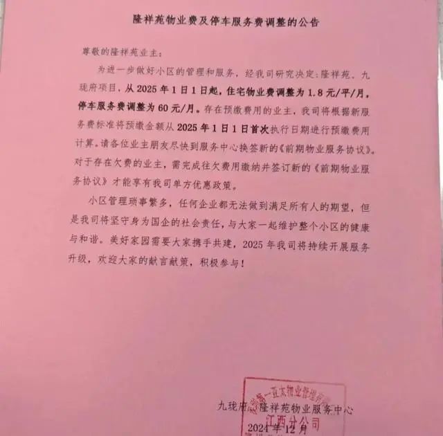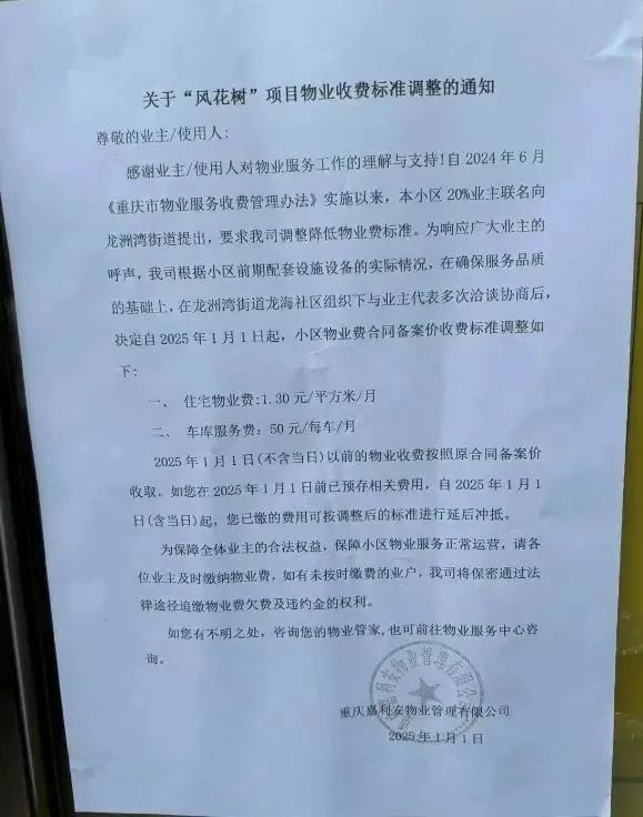 1月1日,重庆市巴南区风花树小区发布物业费标准调整通知:自2025年1月1日起,该小区住宅物业费调整为1.30元/平方米/月,车库服务费调整为50元/每车/月。
