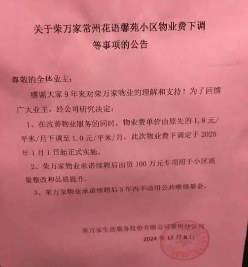 近期,常州花语馨苑小区宣布下调物业费,承诺业主将物业费由原先的1.8元/㎡/月下调至1元/㎡/月,且出资100万元专项用于小区质量整改与品质提升,续聘3年内不动用公共维修基金。