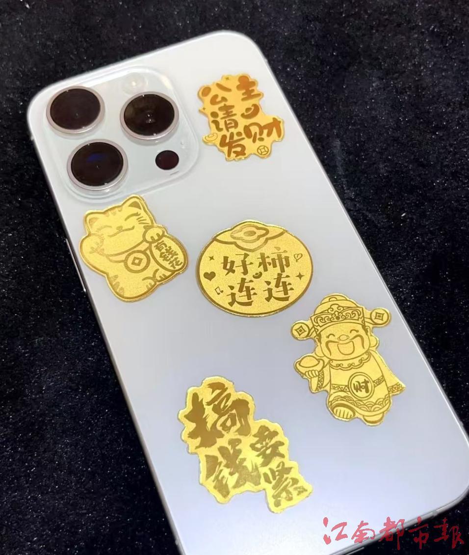 此外,还有一种超小克重的黄金贴纸也开始流行。据了解,每张贴纸的黄金克重通常在0.01克到0.2克之间,价格从几十元到一百多元不等。记者在红谷滩万达商场一家金店注意到,售价为39元的黄金贴纸正在售卖,有的上面写着“好柿连连”“公主请发财”等带有吉祥寓意的文字,有的则是财神、招财猫等卡通形象,不少消费者将其贴在手机壳上作为装饰。