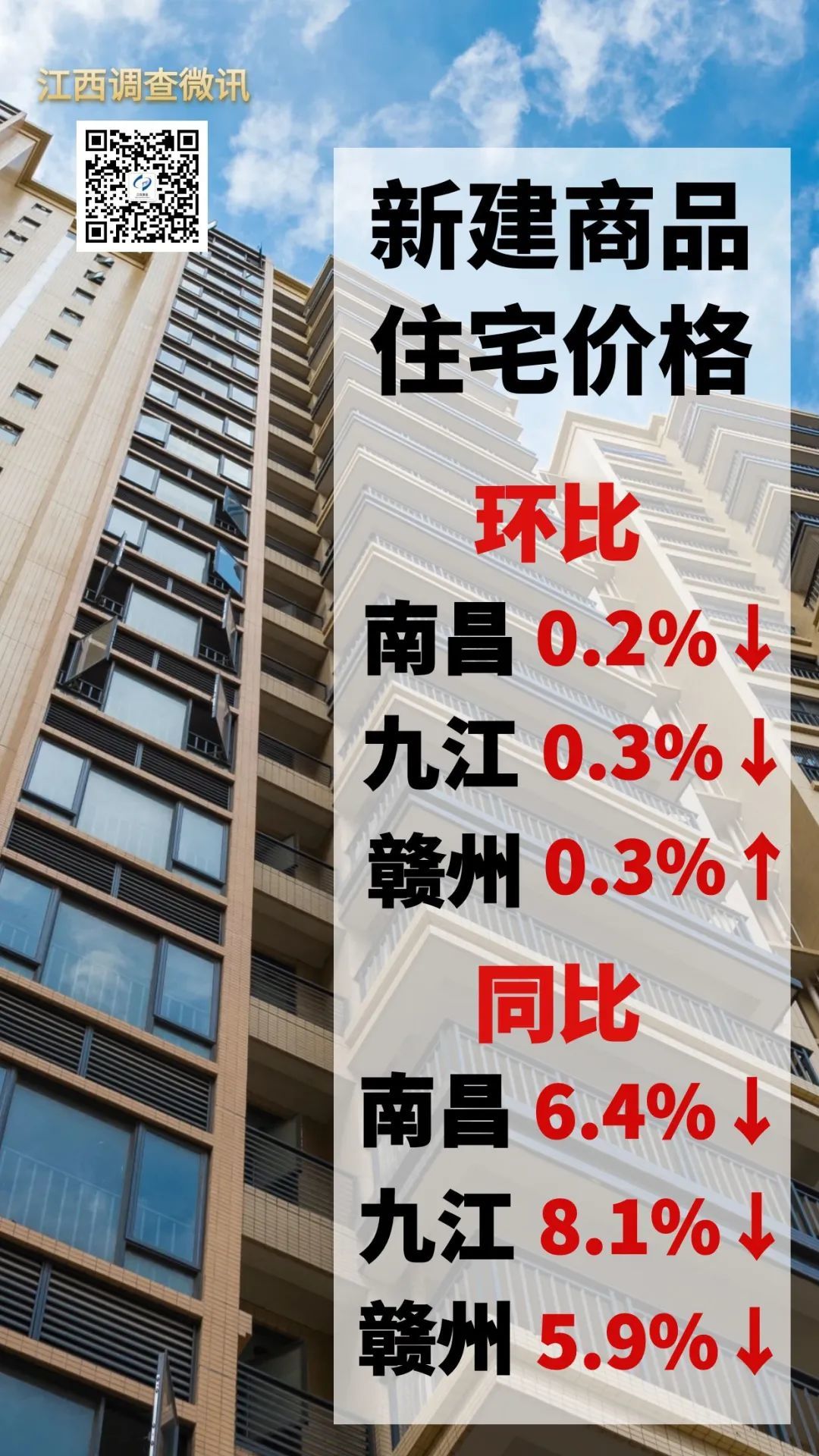 从同比看,三个重点监测城市商品住宅价格同比降幅均收窄。2024年12月份,新建商品住宅销售价格方面,南昌、九江和赣州同比分别下降6.4%、8.1%和5.9%,降幅分别收窄0.4个、0.1个和0.3个百分点。二手住宅价格方面,南昌、九江和赣州同比分别下降10.7%、9.7%和5.9%,降幅较上月分别收窄0.8个、0.4个和0.6个百分点。