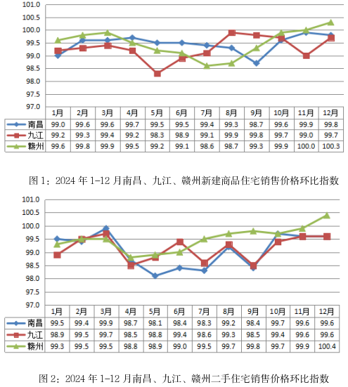 从环比看,赣州新建商品住宅、二手住宅价格转正。2024年12月份,新建商品住宅销售价格方面,南昌环比下降0.2%,降幅较上月扩大0.1个百分点;赣州环比由持平转为上涨0.3%;九江环比下降0.3%,降幅较上月收窄0.7个百分点。二手住宅价格方面,南昌和九江环比均下降0.4%,降幅与上月持平;赣州由下降0.1%转为上涨0.4%。
