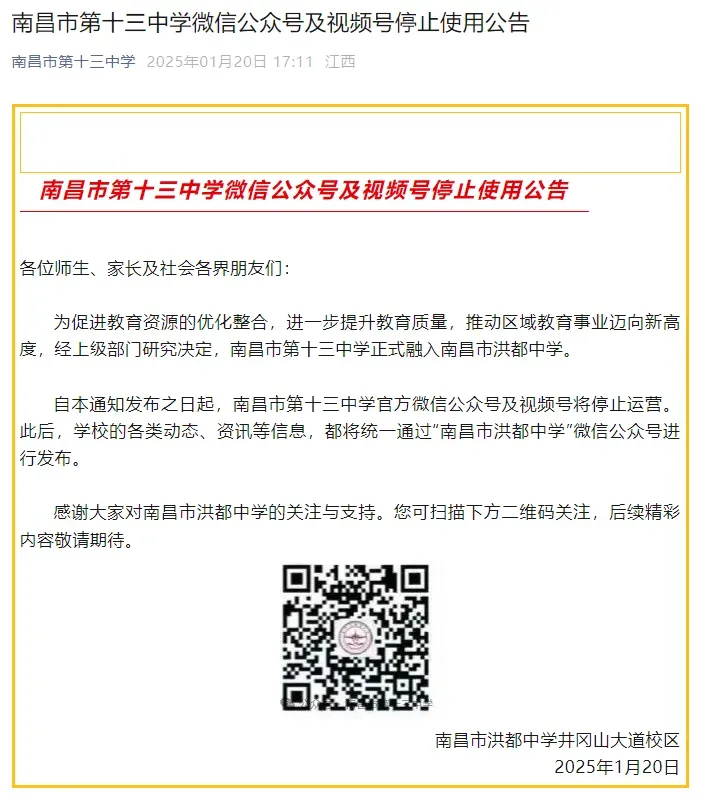 自通知发布之日起,南昌市第十三中学官方微信公众号及视频号将停止运营。此后,学校的各类动态、资讯等信息,都将统一通过“南昌市洪都中学”微信公众号进行发布。