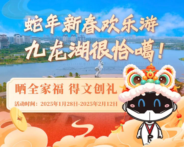 市民和游客游玩九龙湖景区,拍摄全家福并上传至活动共享相册,即可领取九龙湖吉祥物小V纪念品一份!