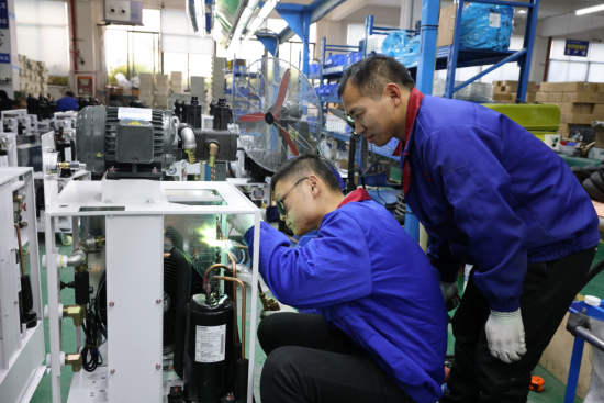 日前,在江西省瑞科制冷科技有限公司的总装车间,3条生产线满负荷运转,工人们正抓紧生产一批冷油机、冷水机,产品将发往全国各地。“目前订单已经排到年后2个月,工人每天加班加点忙生产。”公司董事长余叶飞说。