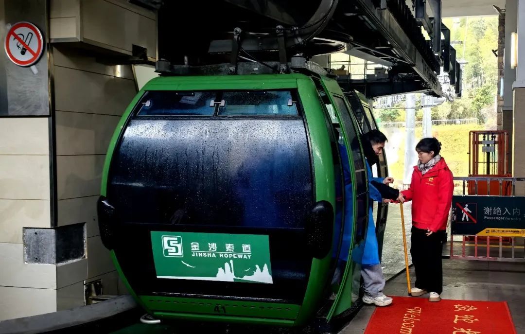 索道工作人员协助游客乘坐缆车