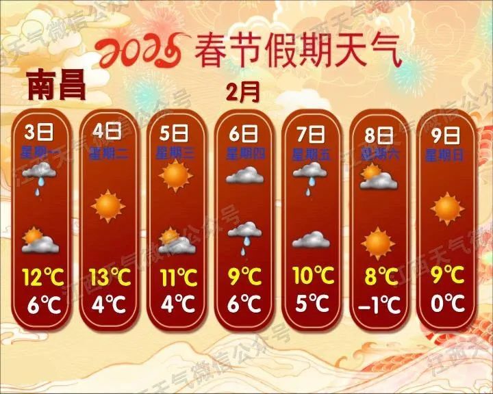 2月3日(初六):赣北阴转多云,赣中、赣南雨停转多云。