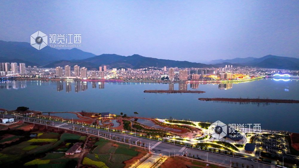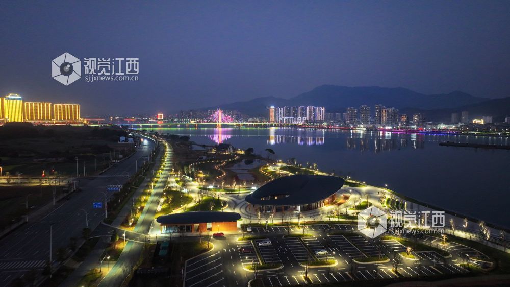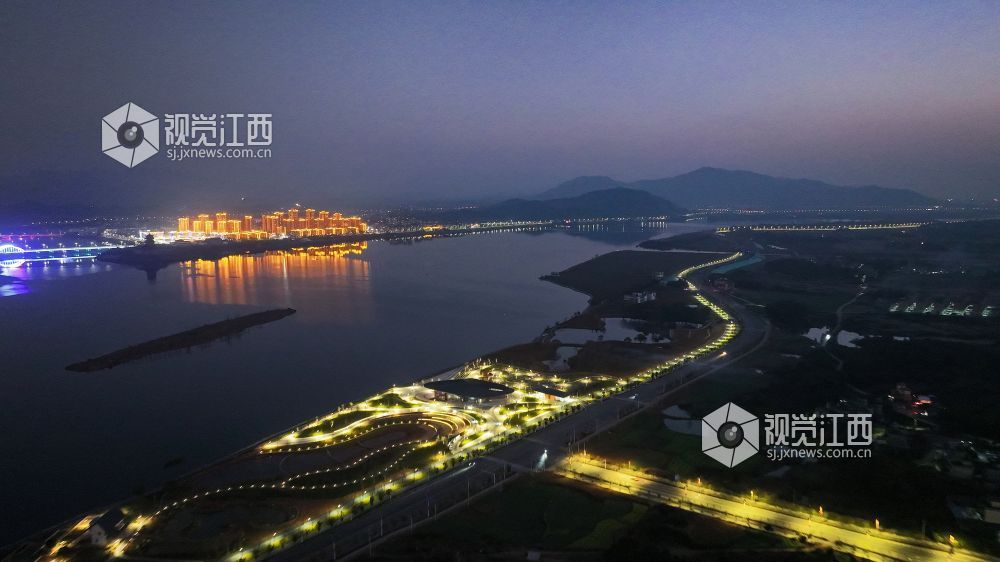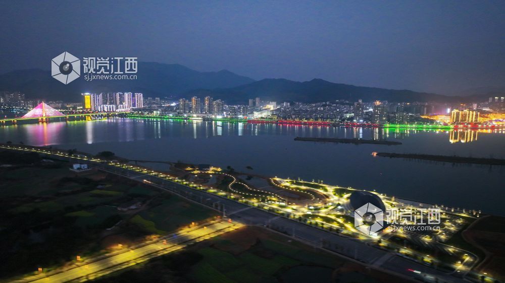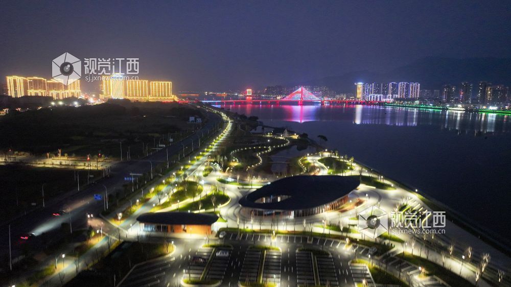 2025年2月4日,江西省吉安市吉水县赣江西岸“金滩·十里画廊”灯光璀璨,和城区的灯火交相辉映,美如画境。