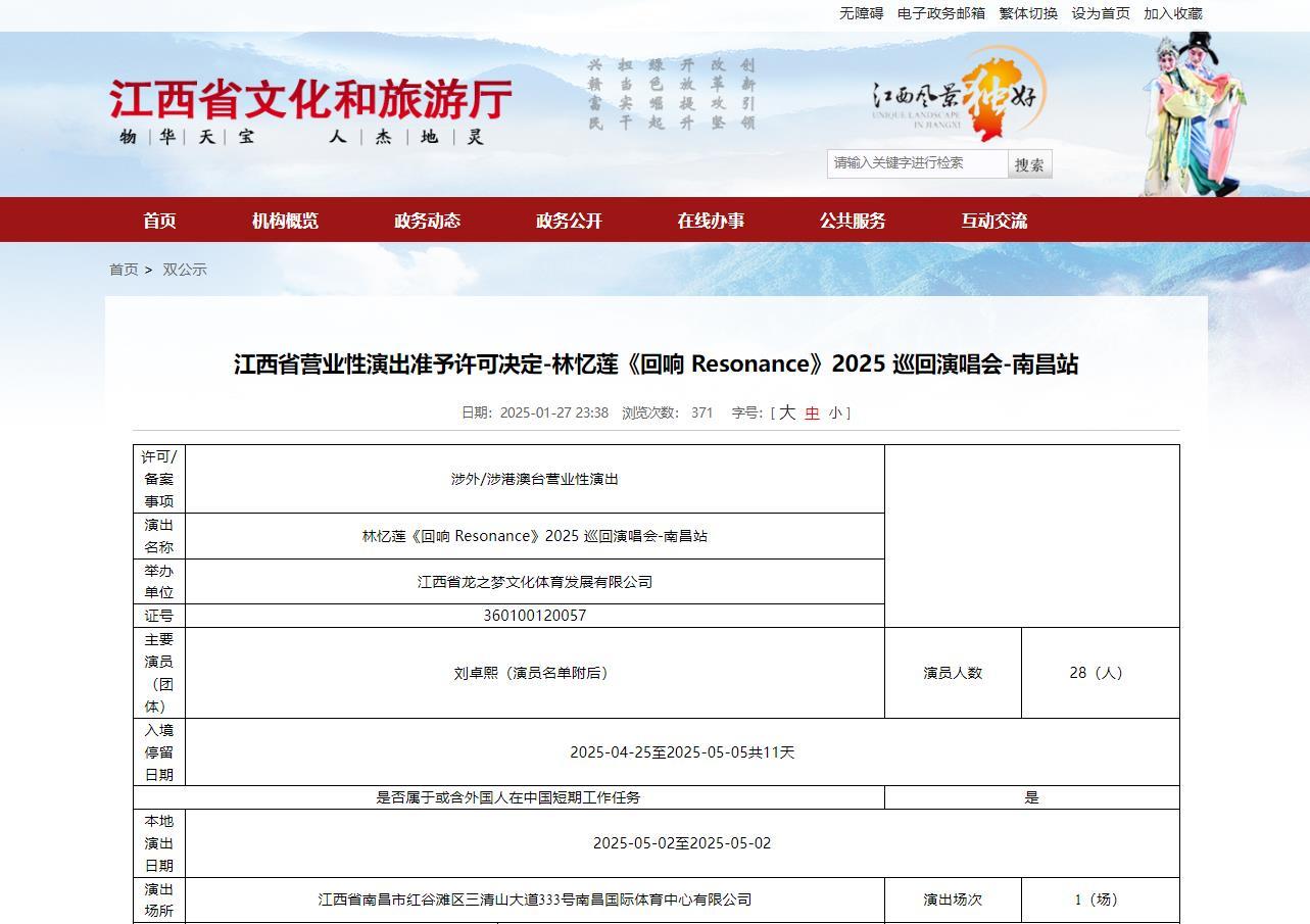 江西新闻客户端讯(全媒体记者朱叶)近日,江西省文化和旅游厅网站发布相关营业性演出准予许可决定称,林忆莲《回响 Resonance》2025 巡回演唱会-南昌站将于2025年5月2日在南昌国际体育中心举行。