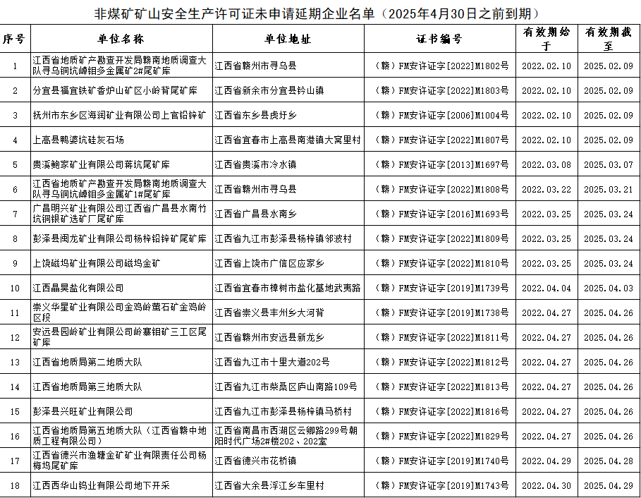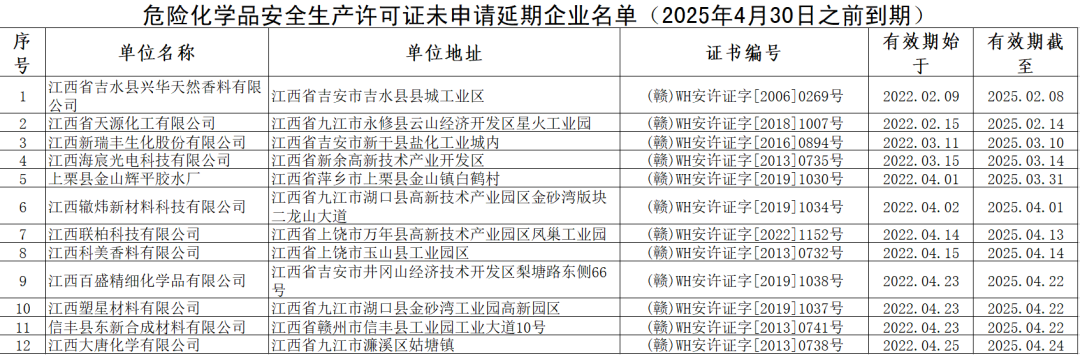 根据江西省应急管理厅“我为群众办实事——应急人在行动”实践活动,围绕打造“五型政府”要求,提供证照延期提醒服务。截止2025年1月31日,安全生产许可证2025年4月30日之前到期、未申请延期企业共计30家,其中:危险化学品生产企业12家,非煤矿矿山生产企业18家,现予以公告。