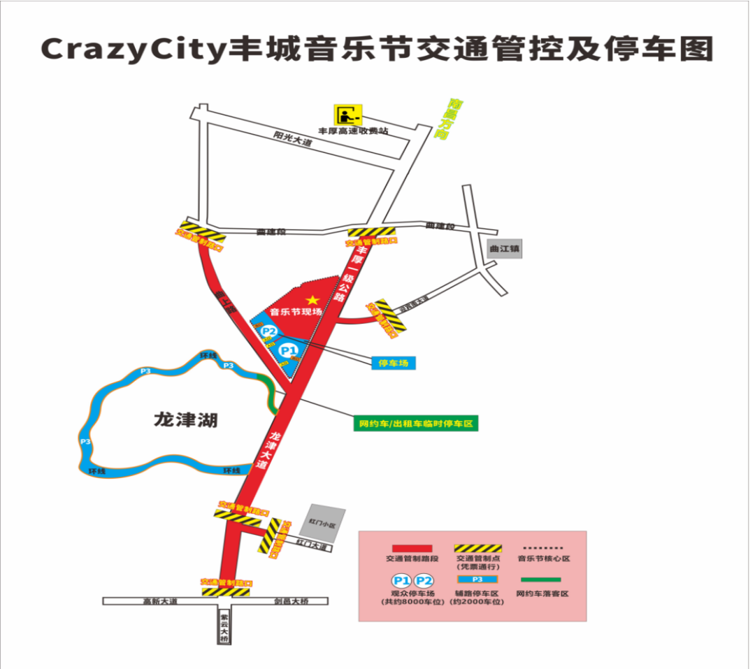 丰城“CrazyCity音乐节”将于2月8日、9日(星期六、星期天)在江西洪州学院体育场举行。为确保活动的顺利开展及活动期间周边道路交通安全、有序、畅通,根据《中华人民共和国道路交通安全法》第39条规定,丰城市公安局交通警察大队届时将对活动现场周边道路部分路段实行交通管制。现通告如下: