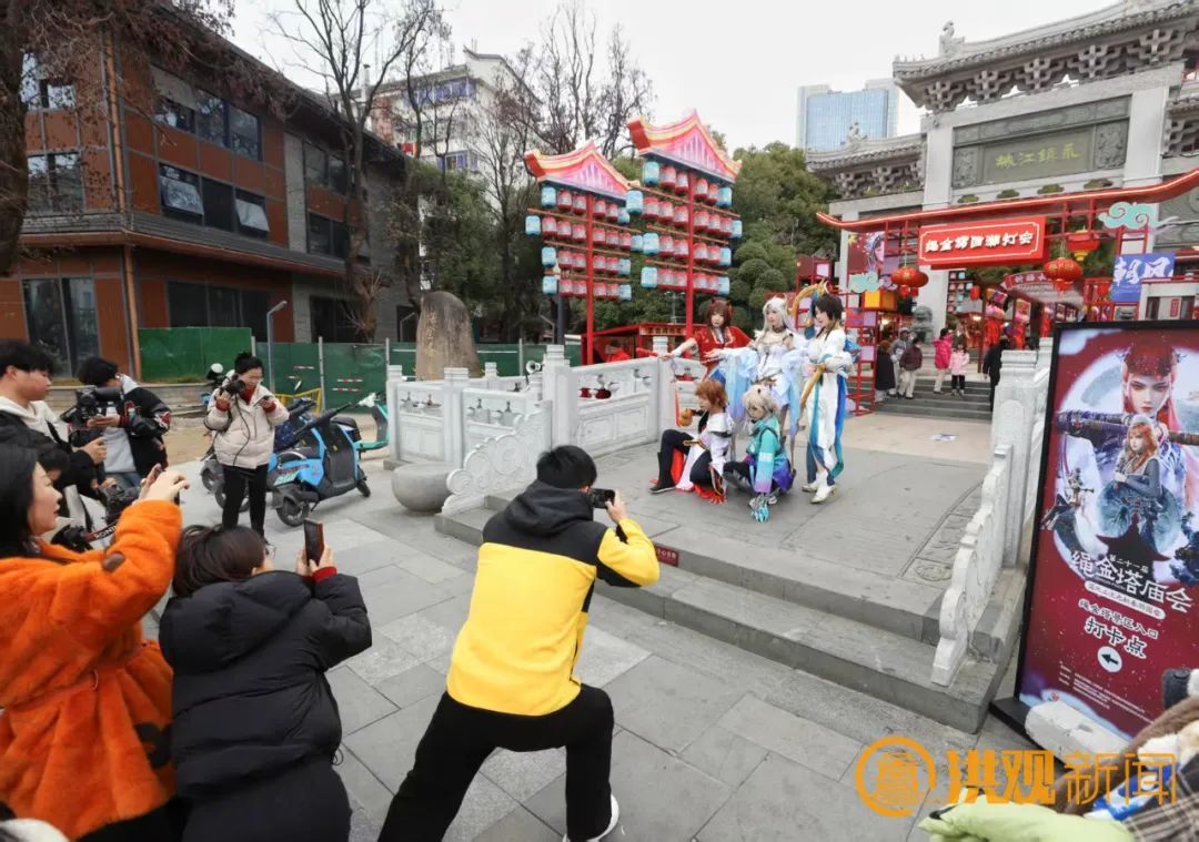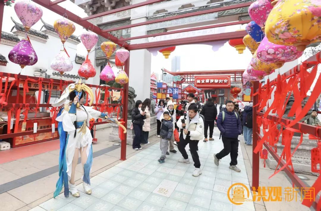绳金塔历史文化街区工作人员胡浩介绍,配合新春游园会,绳金塔历史文化街区还融入《王者荣耀》《黑神话:悟空》等IP,打造灯光秀、千灯宴,还原动漫名场景。在街区招商营销中心,设置一日店长区域,特邀知名动漫角色参与互动,与粉丝共度难忘时光。 “我们在传统庙会中首次尝试‘二次元’国风形式,希望更多人走进绳金塔街区,传播南昌西湖文旅新形象。”胡浩说,绳金塔历史文化街区今年春节客流量30多万人,比去年同期增幅近一倍。