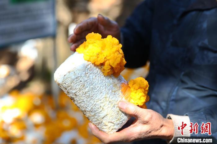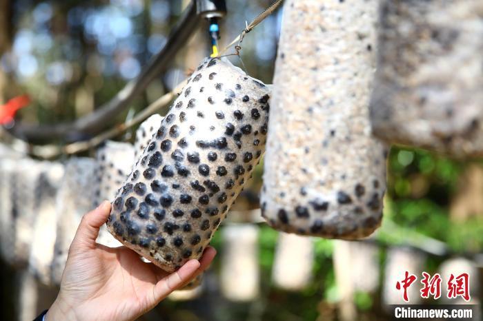 图为基地负责人谢远财拿起种植的食用菌金耳。中新社记者 刘占昆 摄
