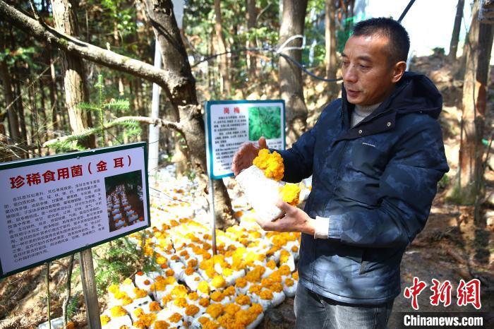 图为基地负责人谢远财准备拿起种植的食用菌金耳。中新社记者 刘占昆 摄