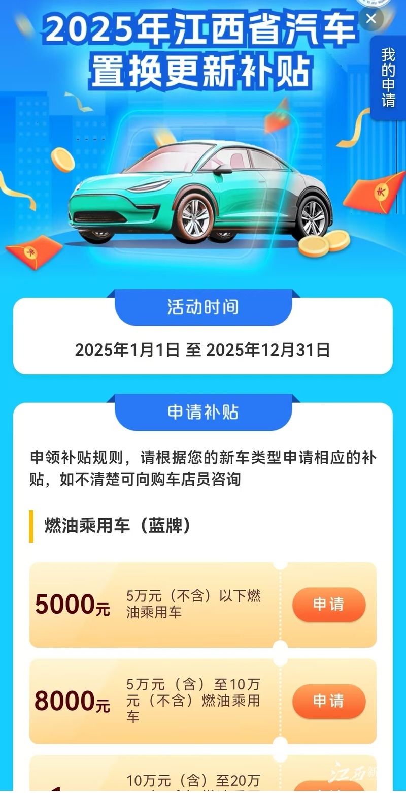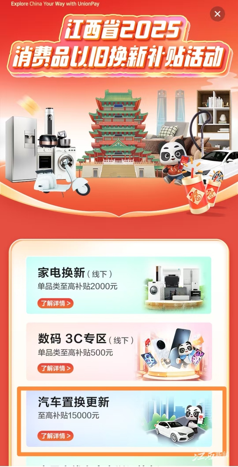 江西新闻客户端讯(全媒体记者朱叶)为做好加力扩围支持汽车以旧换新工作,2月8日,江西省消费品以旧换新服务平台汽车置换更新专区正式上线运行。个人消费者可手机下载注册云闪付APP,首页点击“以旧换新”,进入“2025年消费品以旧换新补贴活动”入口,选择“汽车置换更新”专区,进行补贴申领。