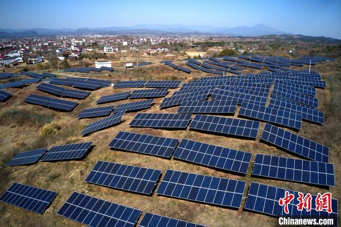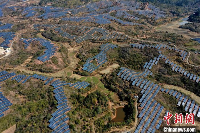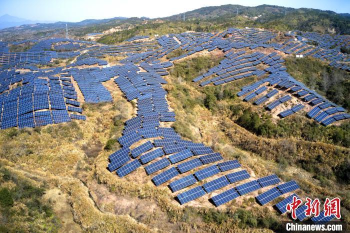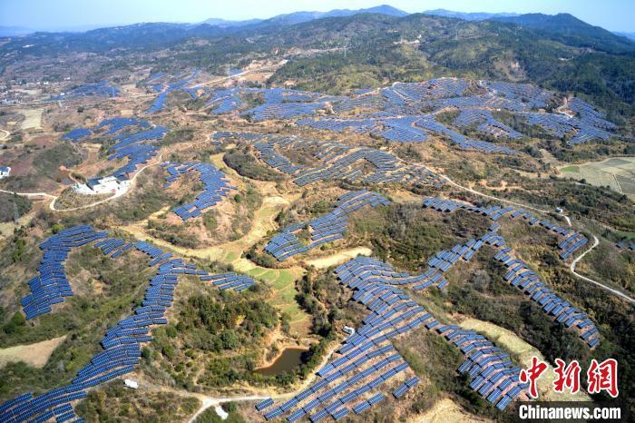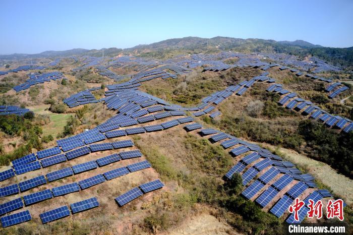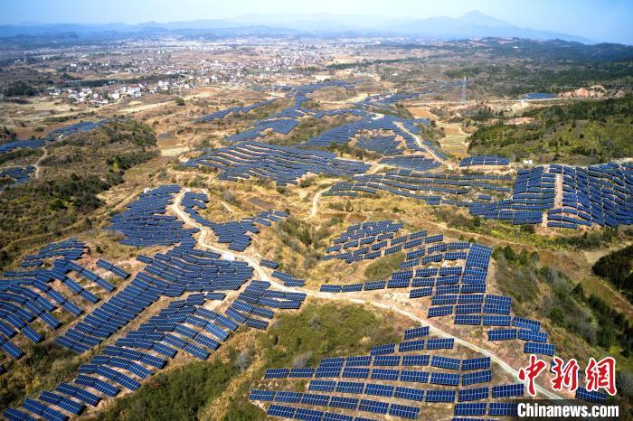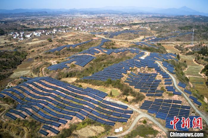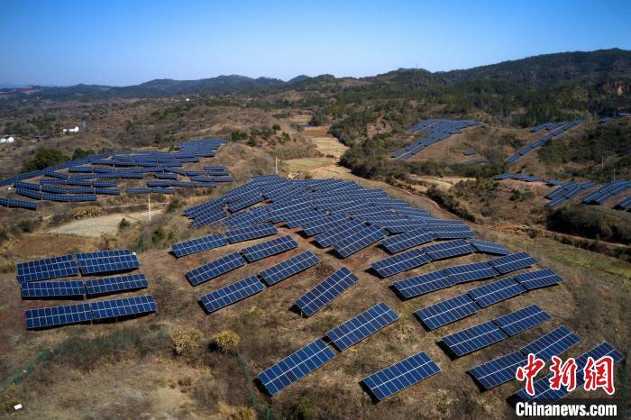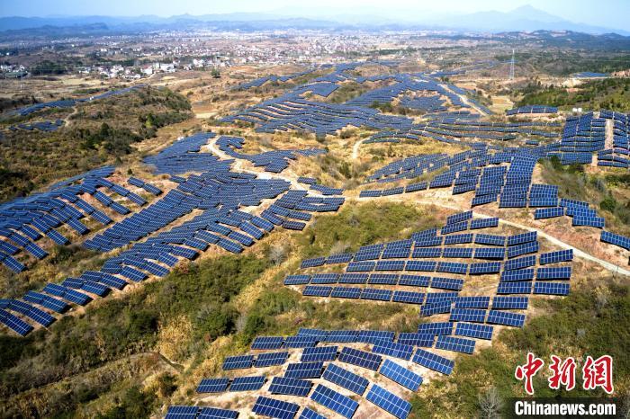 2月9日,航拍江西省抚州市广昌县甘竹镇朝华村一处光伏发电站,鳞次栉比的光伏组件分布在荒山坡上,与延绵群山相映相衬,构成一道独特的风景线。广昌县坚持绿色低碳可持续发展理念,综合利用荒山坡、废弃矿场、厂房屋顶建设光伏发电站,调整能源结构,提高土地和空间利用率让日照资源巧变产业资源,赋能乡村全面振兴,助农增收致富。(无人机照片)中新社记者 刘占昆 摄