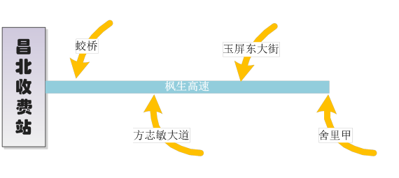 例如枫生高速昌西南收费站:长堎至昌西南收费站段属于开放式高速公路。离昌西南收费站最远的互通为前湖互通,最近的互通为洪州大道互通。