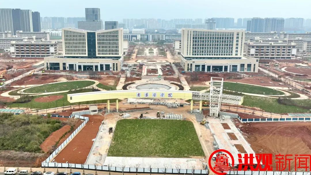 南昌医学院九龙湖校区位于九龙湖片区德兴街以南、复兴大道以北、百丈山路以东、枫生快速路以西区域,项目建设用地854亩,建筑面积31万平方米,可满足在校学生10000人办学规模。目前,项目正按照进度计划有序推进。项目主体建筑全部封顶,二次结构整体完成。北区各建筑室内外装修地砖墙砖、乳胶漆、门窗栏杆、百叶格栅及外幕墙整体完成96%,正在进行精装修收尾。南区19#20#楼首层大堂正在装修,3-9层室内吊顶、涂料及外幕墙加快收尾;21#22#23#楼室内吊顶及涂料收尾,泳池贴砖、室内木地板及运动地板正在施工;南大门、体育看台、围墙等附属建筑正在进行结构施工,室外工程已全面铺开施工,新校园美丽蓝图正在逐步变成现实。