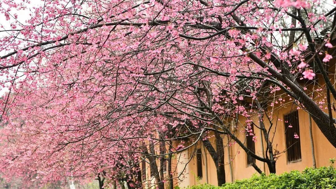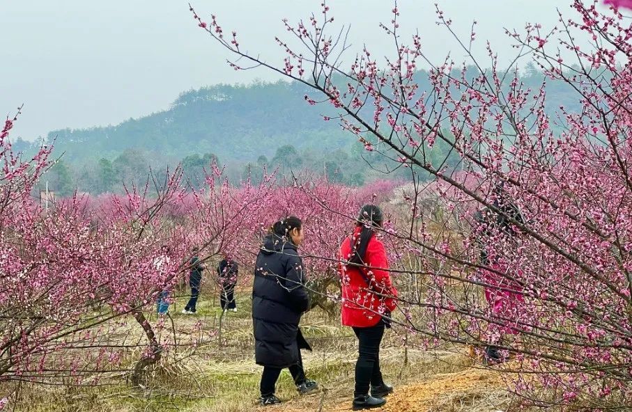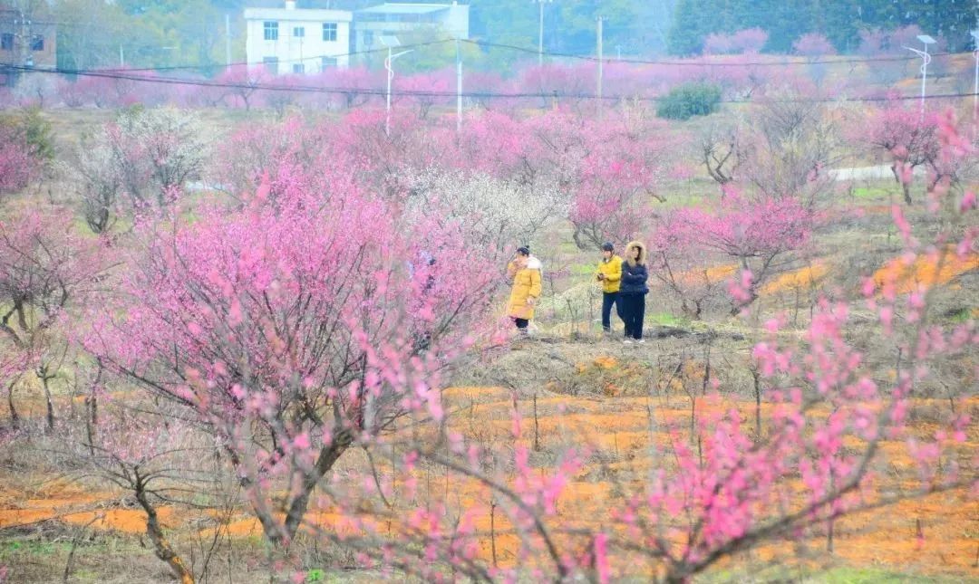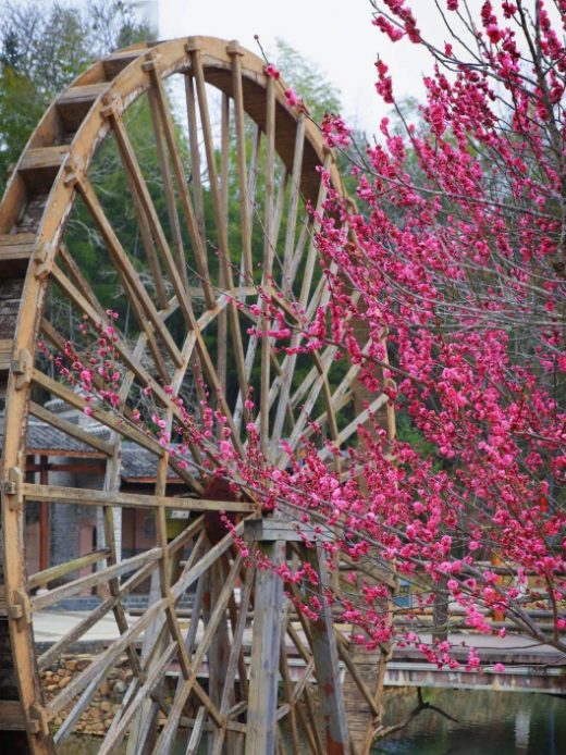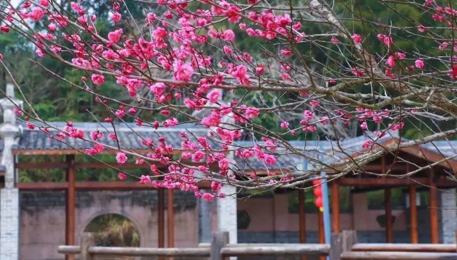 虽以十万株山樱花闻名,但五龙客家风情园内红梅也不容错过!梅林点缀于客家围屋与江畔木栈道旁,粉红花瓣随风飘落,与樱花交织成一场“双色花雨”。登高远眺,客家风情与花海相融,春意盎然。