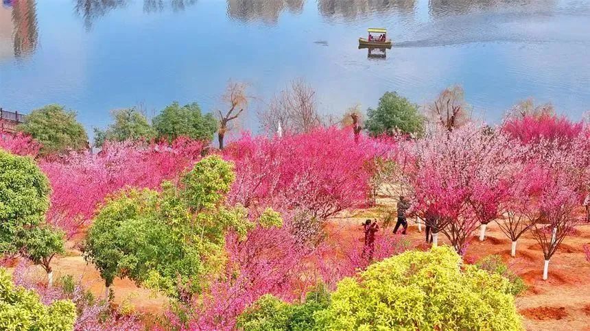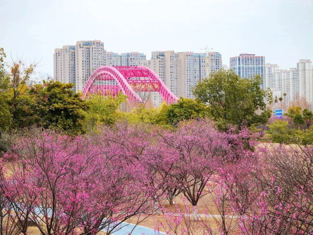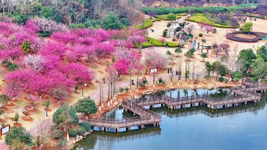 作为赣州“工业废地变生态花园”的典范,金凤梅园内近万株红梅、三角梅竞相绽放,亭台楼阁与湿地景观相映成趣。漫步其间,既可捕捉梅花与城市天际线同框的现代诗意,亦能在曲径通幽处感受“疏影横斜水清浅”的古韵。