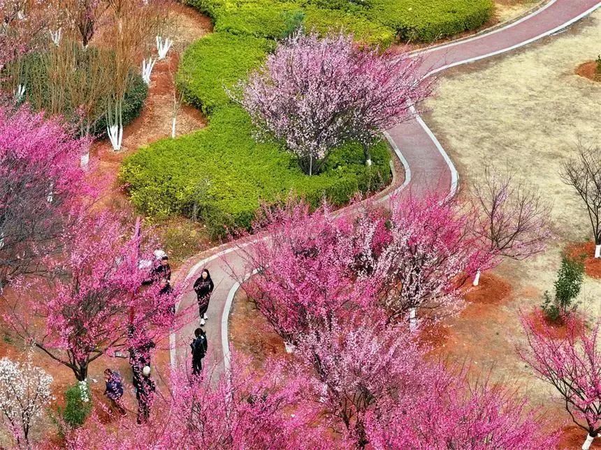 眼下,赣州蓉江新区十里花溪公园精品梅园梅花争相绽放,吸引游客前来拍照打卡。朵朵嫣红绽放枝头,淡淡梅香弥漫在空气中,令人心旷神怡。